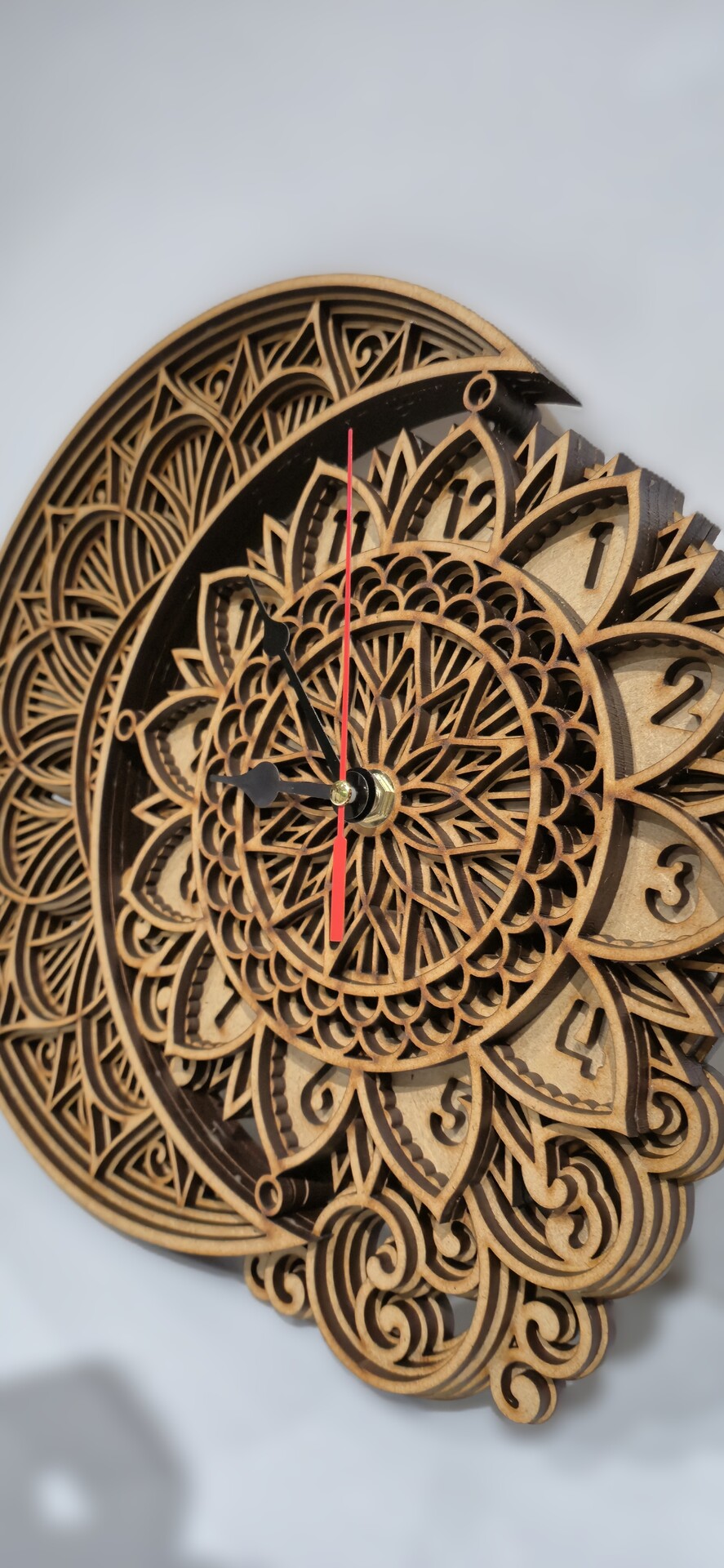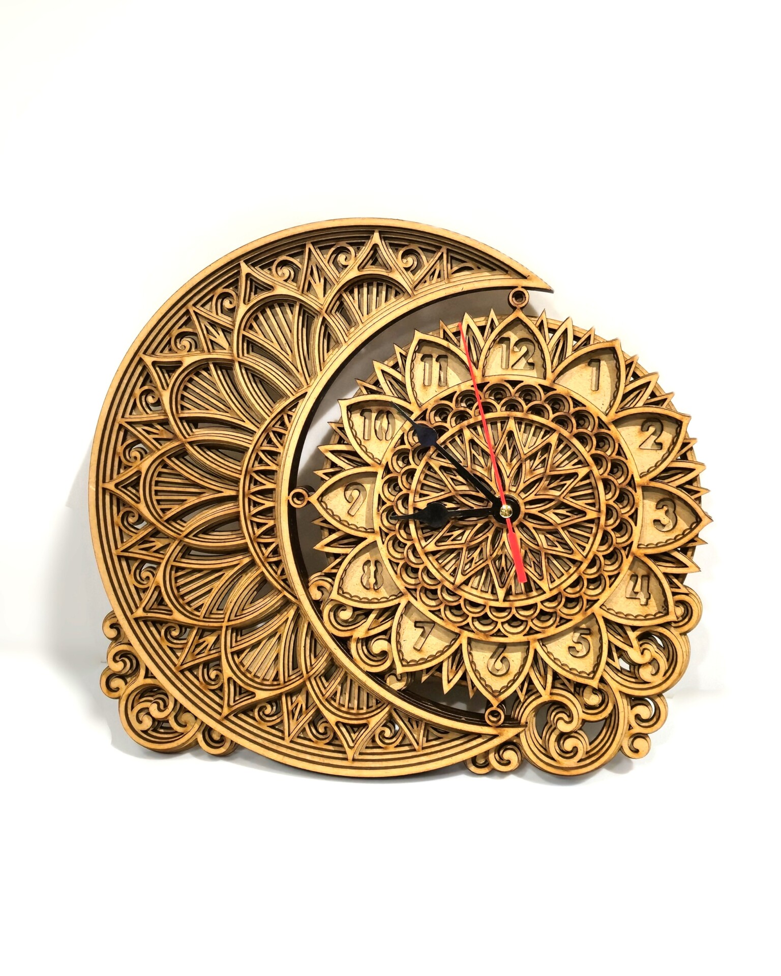 Ceas decorativ de perete din lemn, model cu Soarele și Luna. Realizat din 5 planuri ce îi conferă un aspect 3D. Mecanism silențios, baterie inclusă.