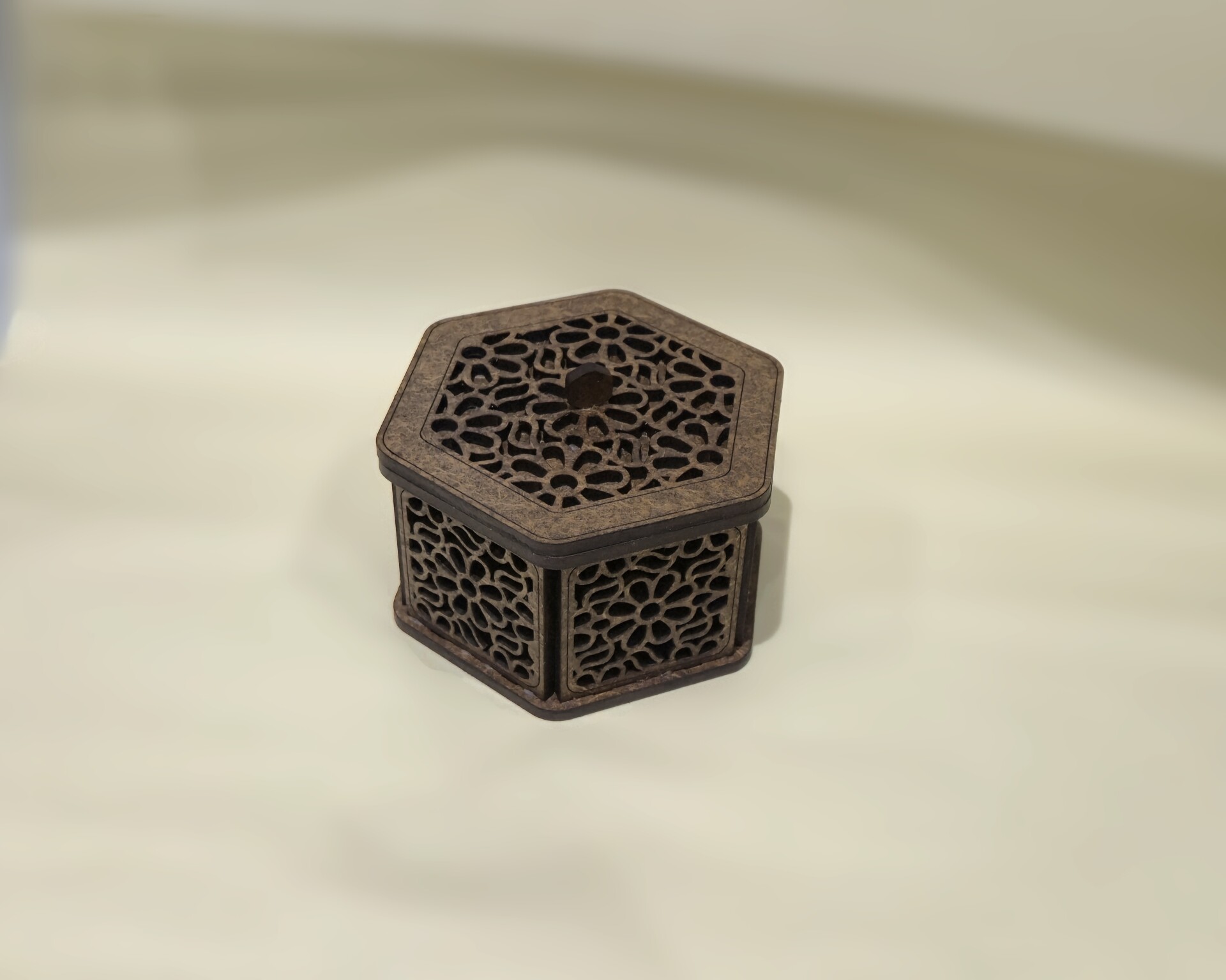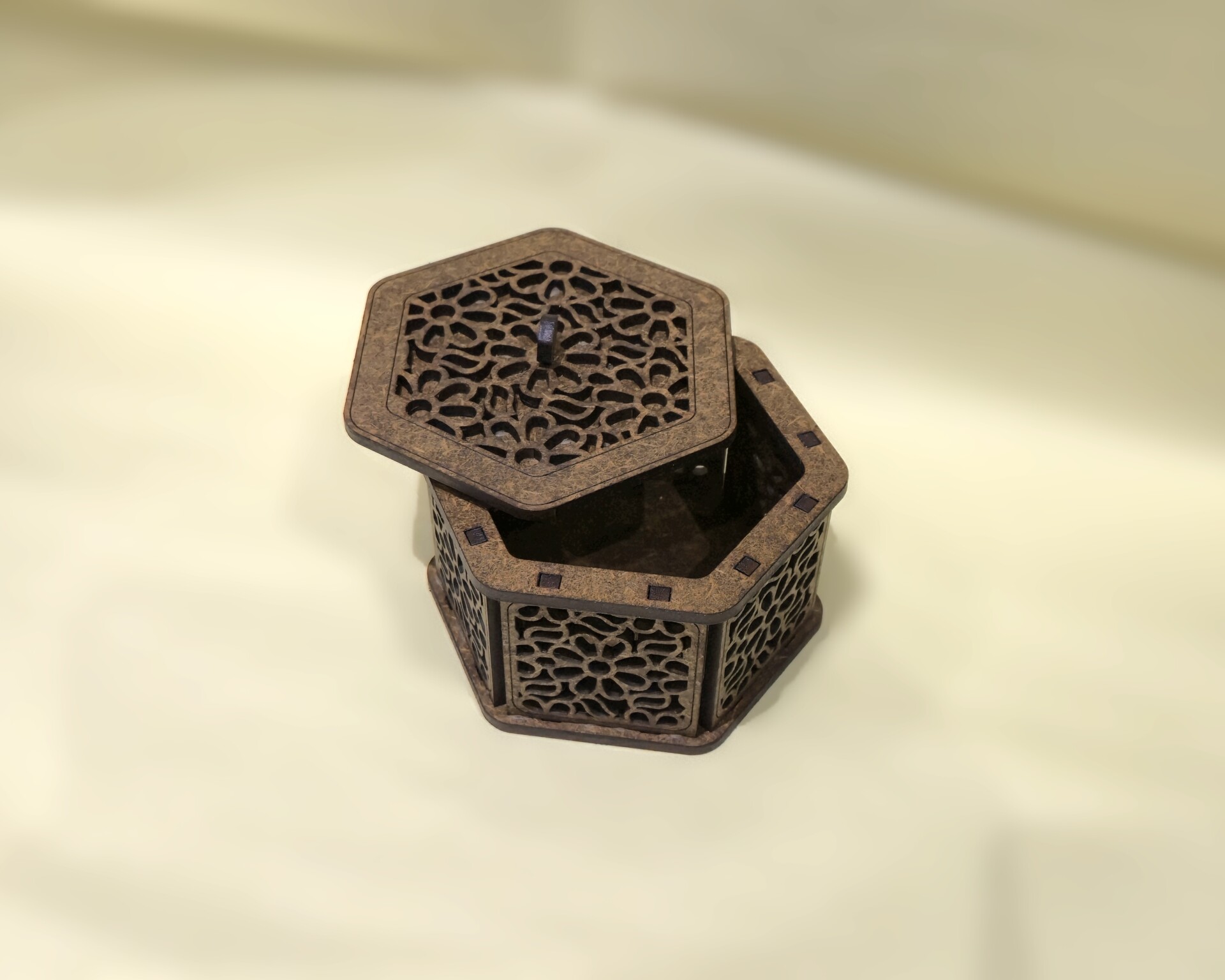 Adaugă un accent sofisticat decorului tău cu cutia DecominiC, o piesă rafinată realizată manual din lemn cu finisaj în nuanța caldă a nucului. Cu un design hexagonal și decupaje ornamentale fine, această cutie impresionează prin eleganța sa naturală și atenția la detalii.