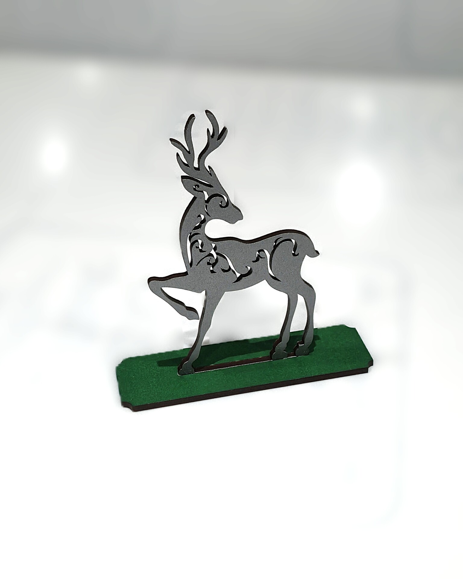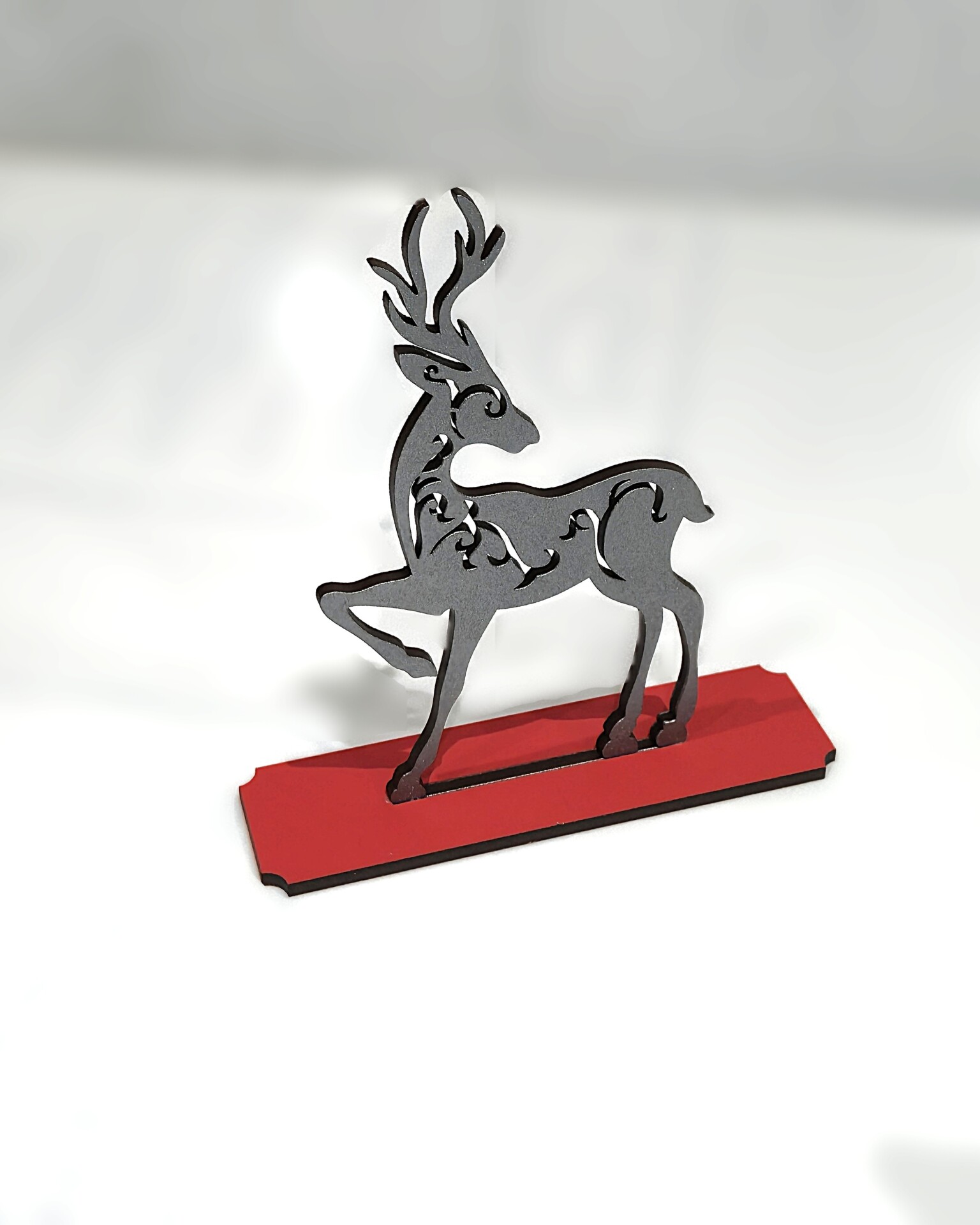 Figurină decorativă cu siluetă de ren, realizată prin decupaj artistic, ideală pentru decoruri de masă, vitrine tematice sau cadouri de sezon. Fiecare ren este montat pe o bază colorată (roșie sau verde), cu decupaje fine în corp și coarne, evocând eleganța iernii.