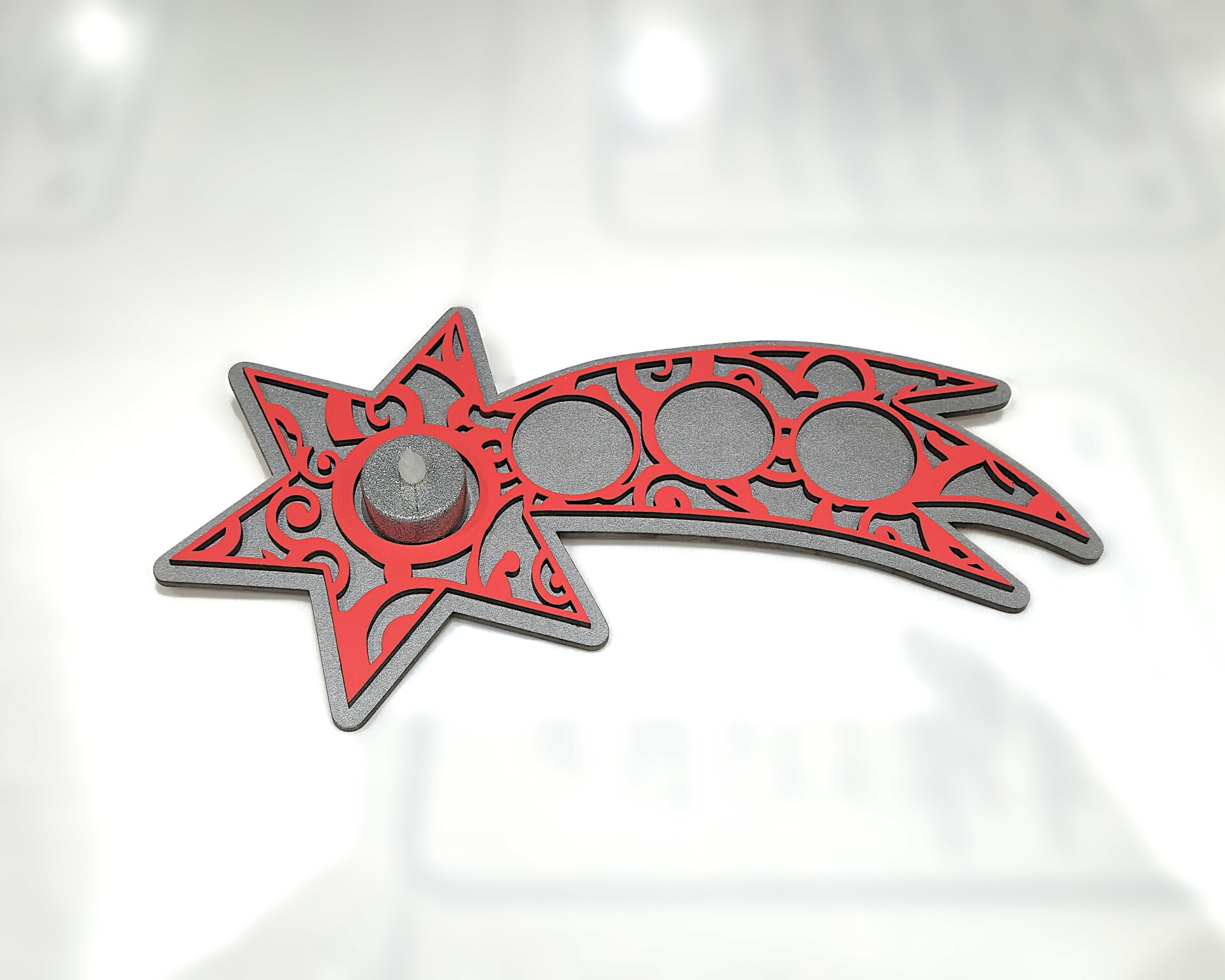 Stea decorativă de masă, realizată din două planuri suprapuse decupate cu precizie laser, ideală pentru aranjamente festive, cadouri simbolice sau decoruri tematice. Cu un design curbat și detalii ornamentale roșii, această piesă evocă magia dorințelor împlinite în sezonul sărbătorilor.