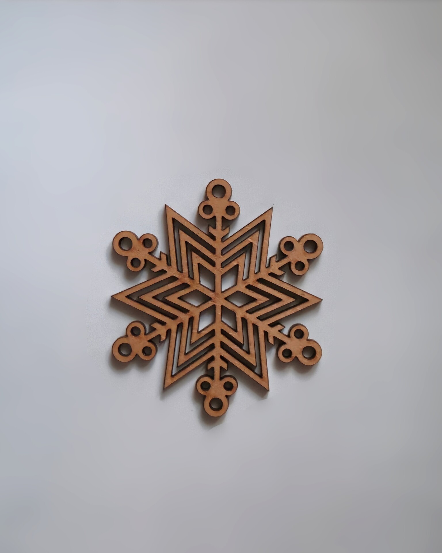 Ornament din lemn cu ramuri simetrice și decupaje circulare, într-un design geometric ce evocă structura naturală a fulgilor de gheață. Ideal pentru decoruri suspendate, etichete de cadou sau proiecte handmade cu tematică de iarnă.