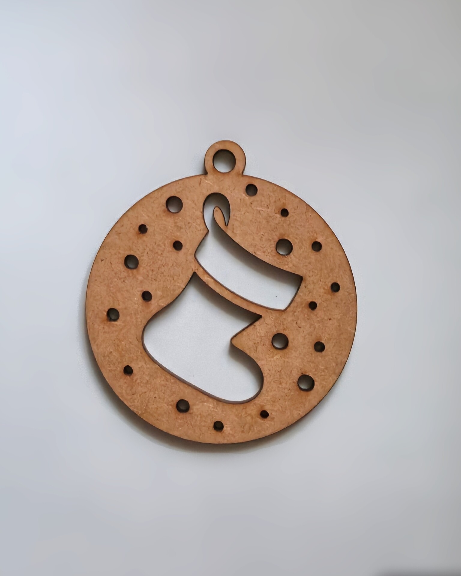 Blank rotund din lemn, cu decupaj central în formă de ciorăcel de Crăciun și perforații circulare pe contur. O piesă jucăușă și festivă, ideală pentru decoruri de brad, ambalaje creative sau proiecte handmade tematice.