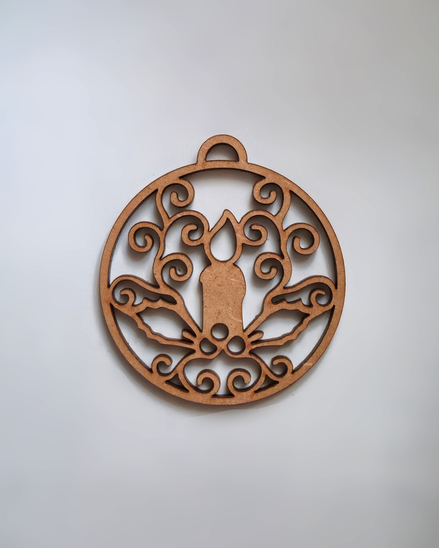 Blank rotund din lemn, cu decupaj central reprezentând o lumânare aprinsă, înconjurată de frunze de ilex și motive florale. Designul ornamental și echilibrul vizual îl fac potrivit pentru decoruri suspendate, cadouri simbolice sau proiecte handmade premium.