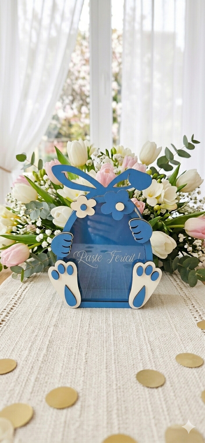 Contrastul dintre albastrul intens și elementele galben pal, împreună cu textul elegant „Paște Fericit!” gravat pe fereastra transparentă, transformă acest iepuraș într-un cadou ideal pentru cei dragi, vestind sosirea primăverii într-un mod delicios.