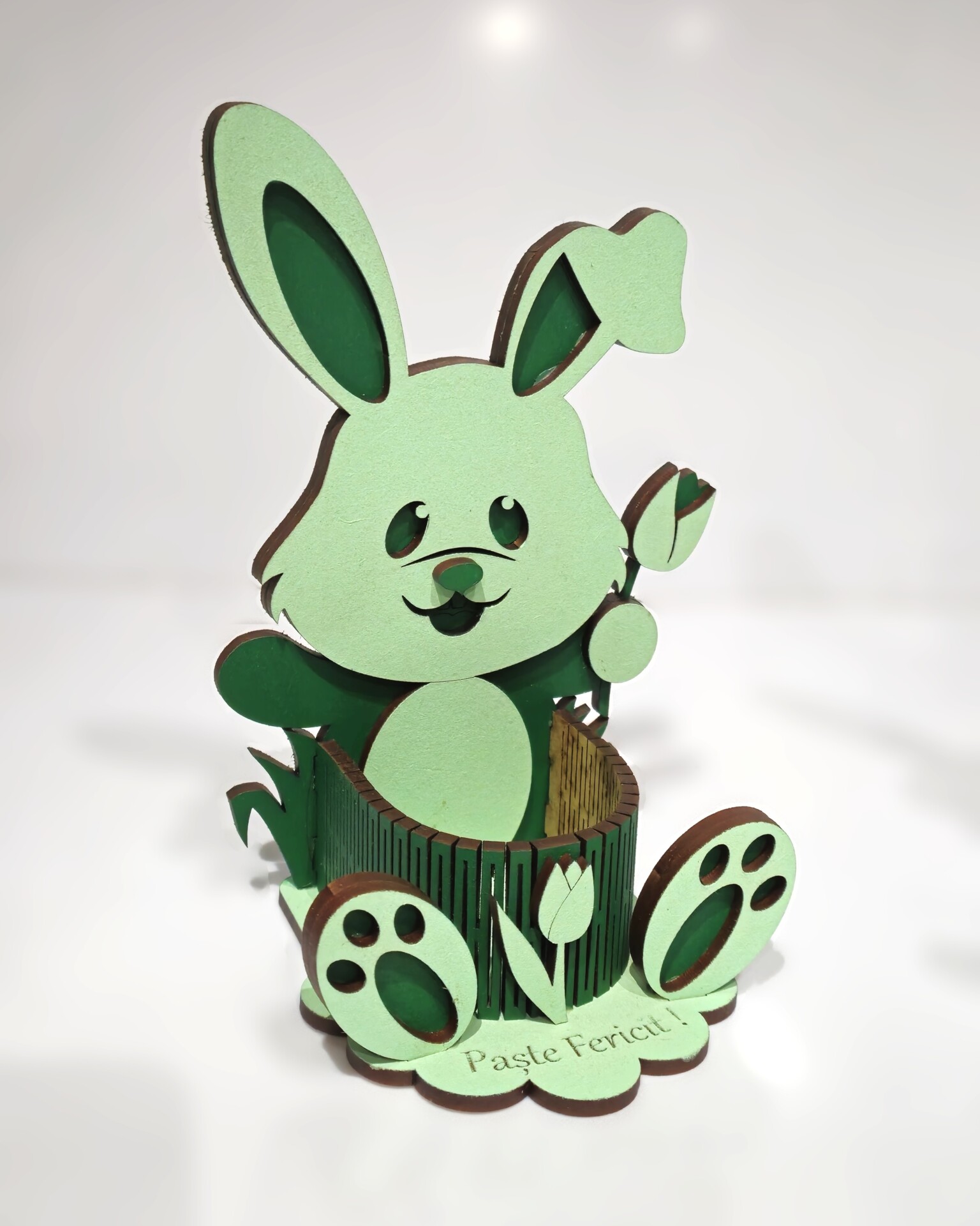 Iepuraș verde cu verde pal, din lemn, cu gravură „Paște Fericit!”