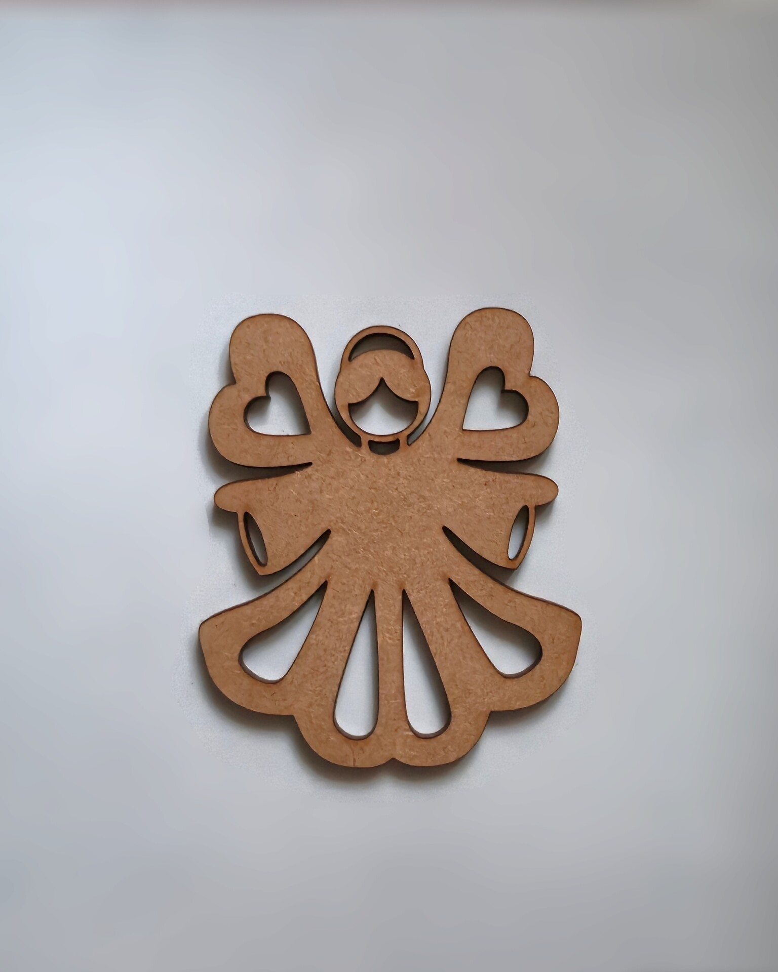 Figurină din lemn cu siluetă stilizată, aripi în formă de inimă și decupaje fluide în partea inferioară. Designul simetric și expresiv transmite căldură, protecție și eleganță, fiind ideal pentru decoruri spirituale, cadouri simbolice sau proiecte handmade de Crăciun.