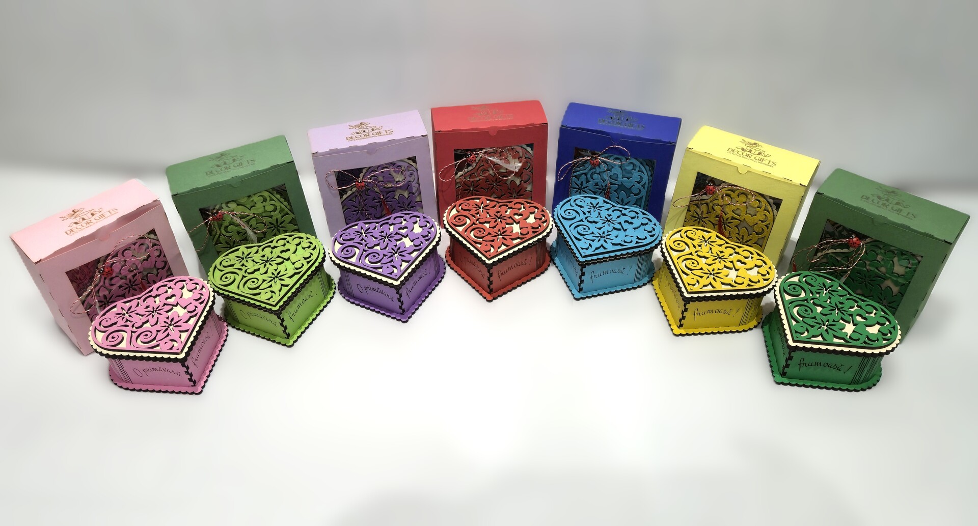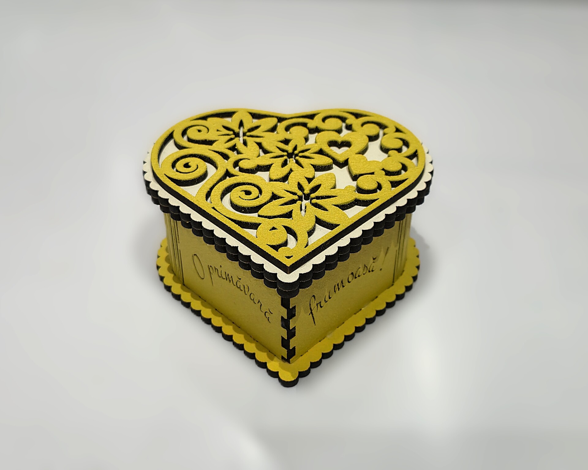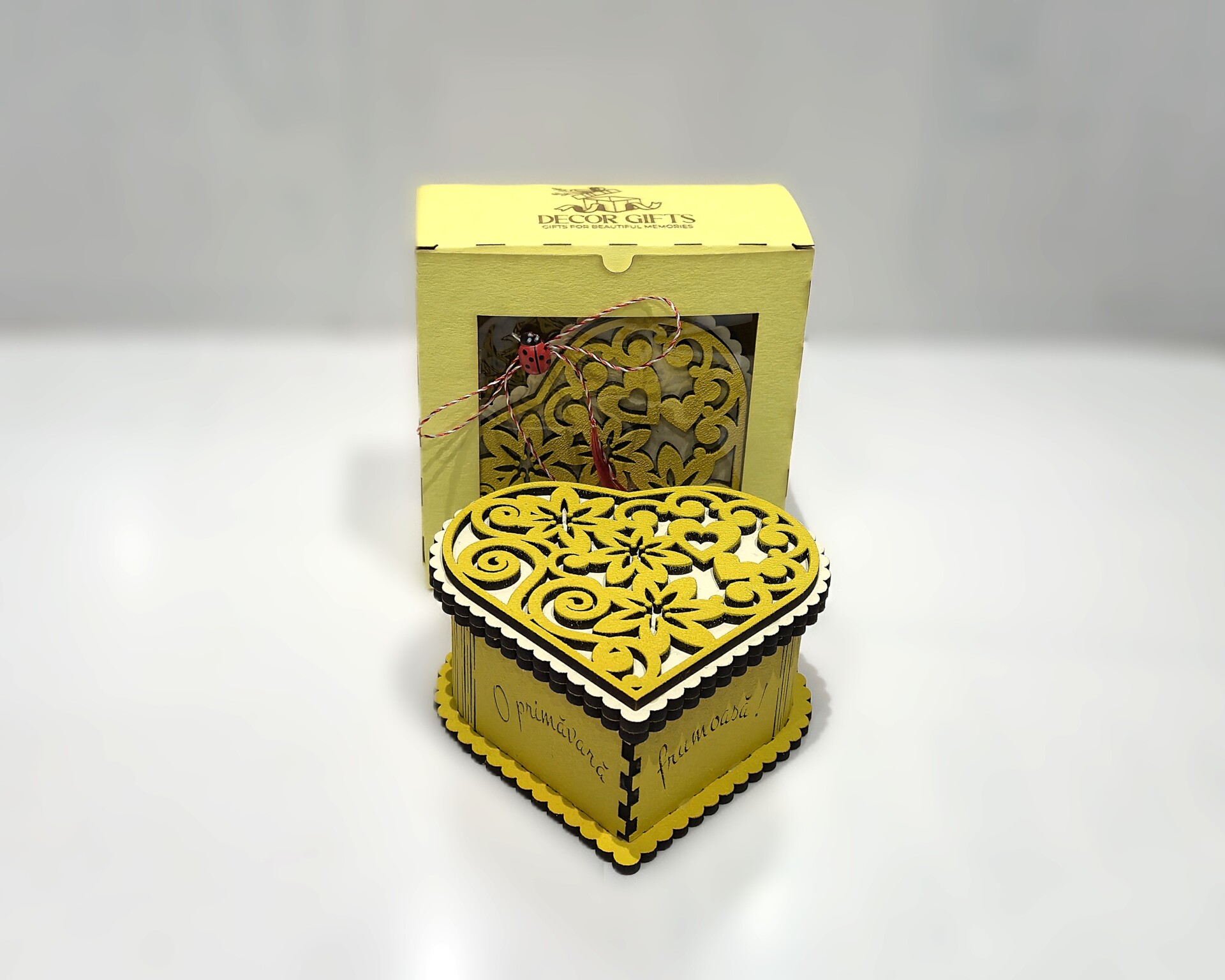 🌸 Mărțișor în formă de inimioară este realizat din lemn şi decorat cu un model floral decupat cu precizie laser. Pe lateral este gravat mesajul „O Primăvară frumoasă!”, oferind un plus de eleganță și simbolistică sezonieră. Cutia are dimensiunile 10 × 9,5 × 5 cm și este ambalată într-o cutie asortată, cu șnur tradițional şi buburuză decorativă – simbol al norocului și primăverii.