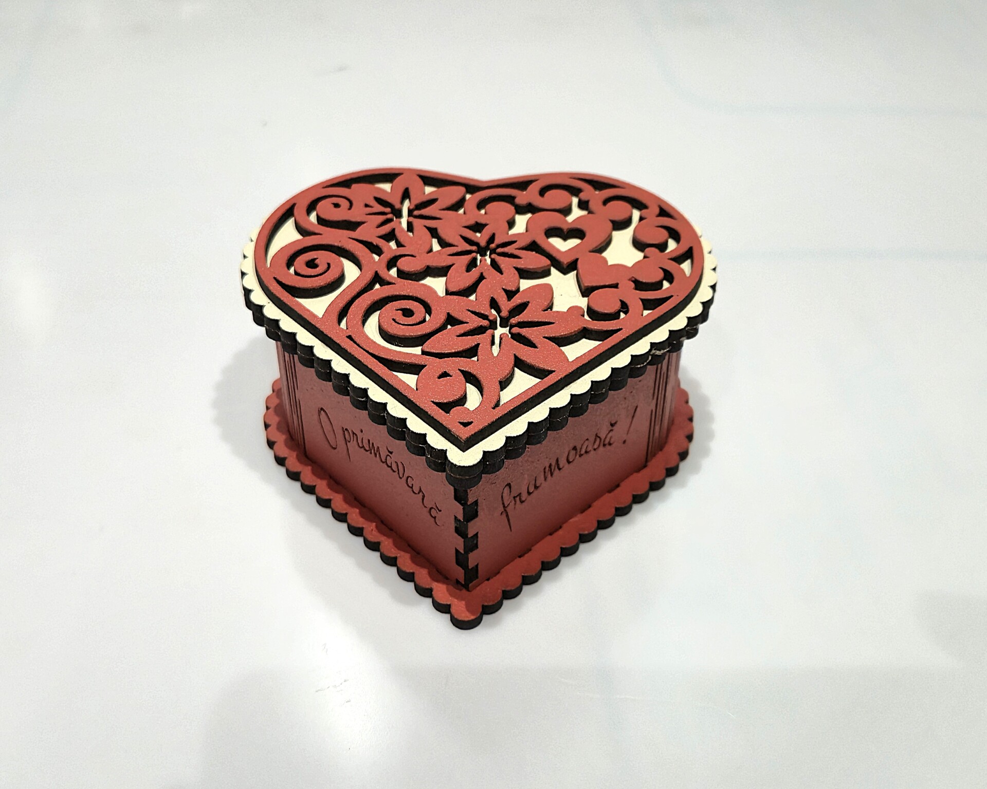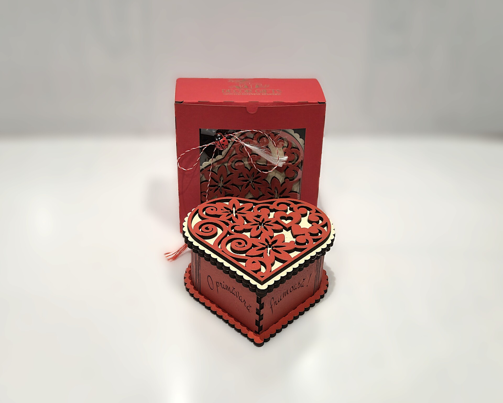 🌸 Mărțișor în formă de inimioară este realizat din lemn și decorat cu un model floral decupat cu precizie laser. Pe lateral este gravat mesajul „O Primăvară frumoasă!”, oferind un plus de eleganță și simbolistică sezonieră. Cutia are dimensiunile 10 × 9,5 × 5 cm și este ambalată într-o cutie asortată, cu șnur tradițional şi buburuză decorativă – simbol al norocului și primăverii.
