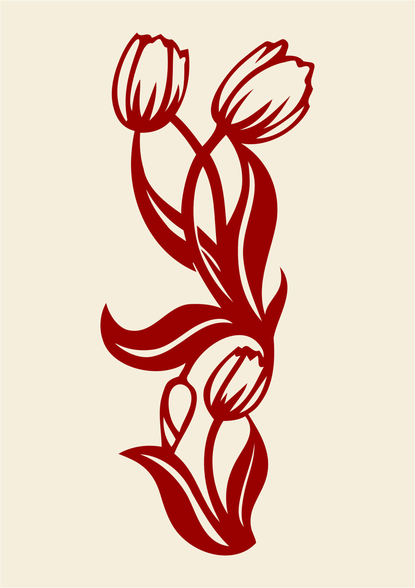 🔸 Design floral expresiv – Lalele stilizate cu tulpini și frunze alungite, într-o compoziție fluidă și echilibrată.