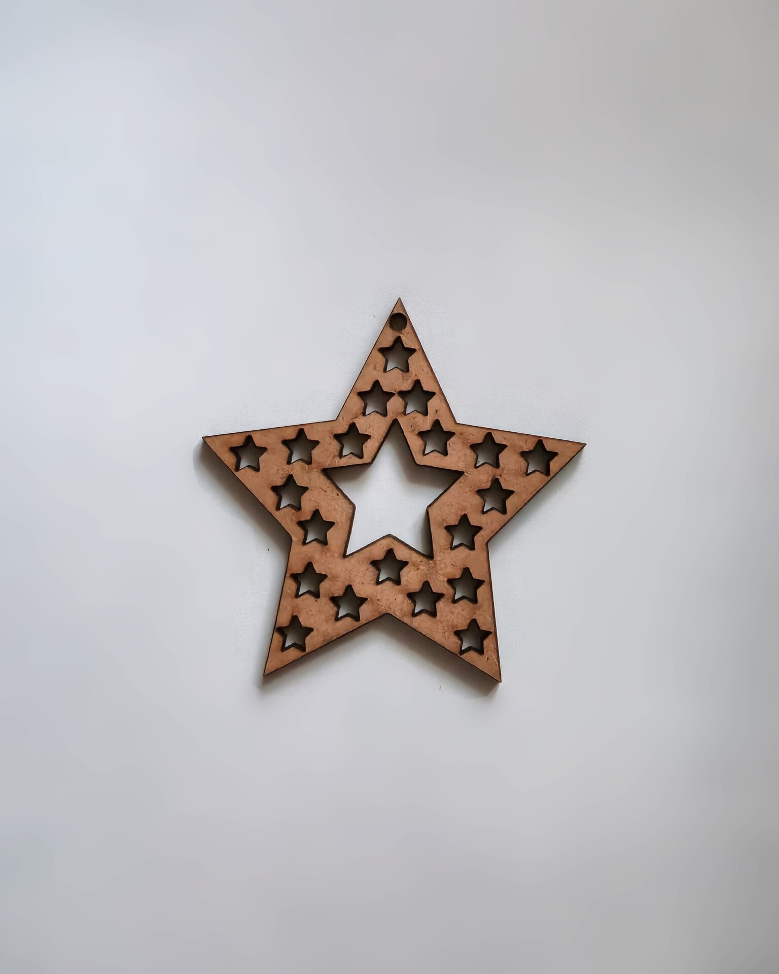 Ornament din lemn în formă de stea, cu decupaj central în formă de stea și multiple stele mici distribuite uniform. Designul aerat și simetric creează un efect vizual spectaculos, ideal pentru decoruri suspendate sau ambalaje premium.