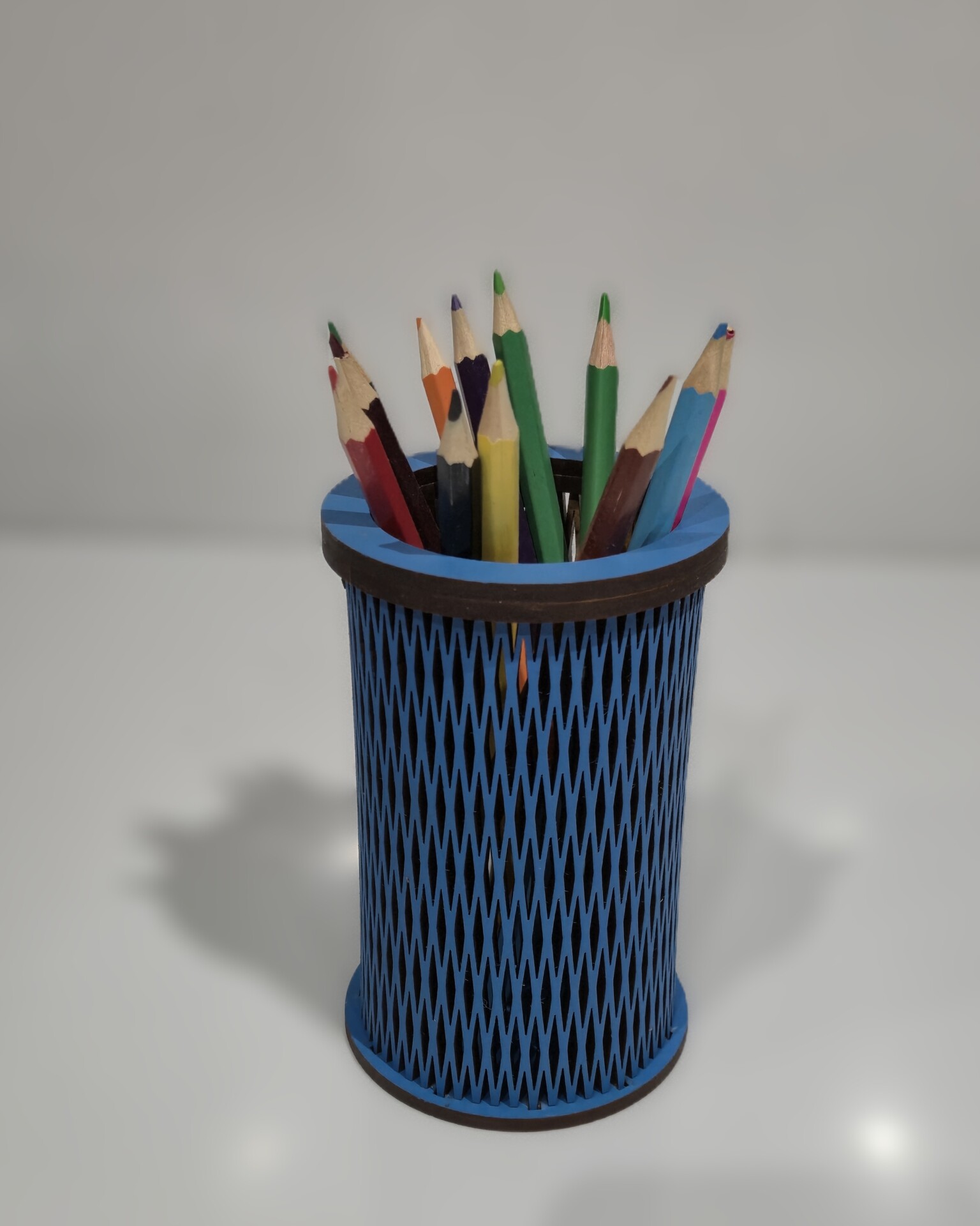 Suport de creioane cilindric albastru din lemn.