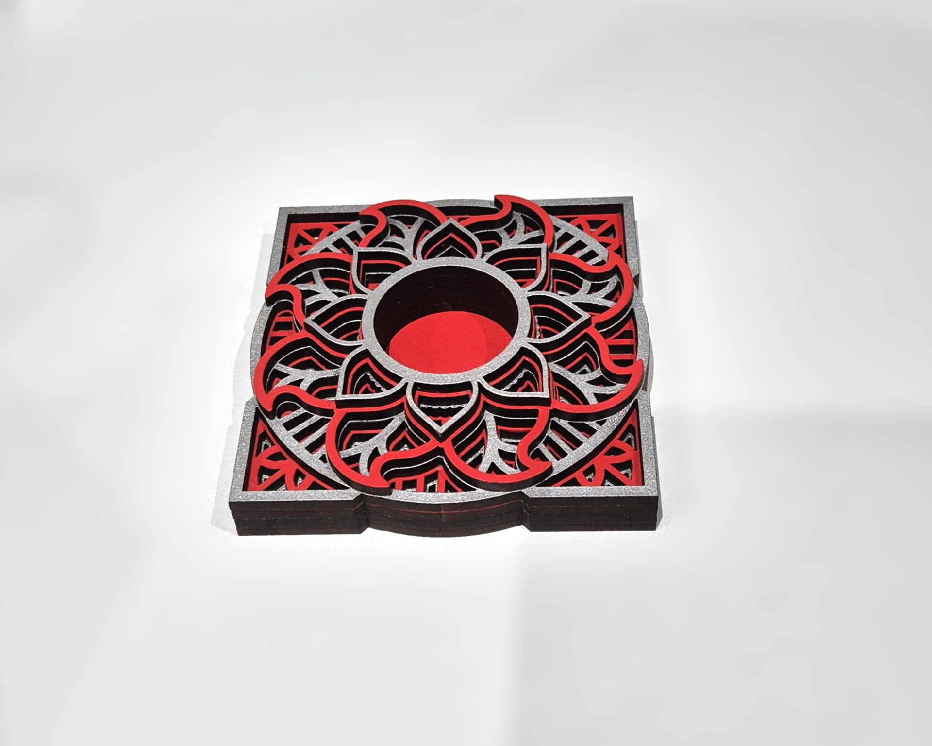 Suport decorativ pentru lumânare, realizat din lemn decupat laser în 6 straturi, cu model mandala geometric și floral. Cu dimensiuni compacte de 11 × 11 × 1,5 cm, este ideal pentru decoruri de masă, ritualuri simbolice sau cadouri artizanale.