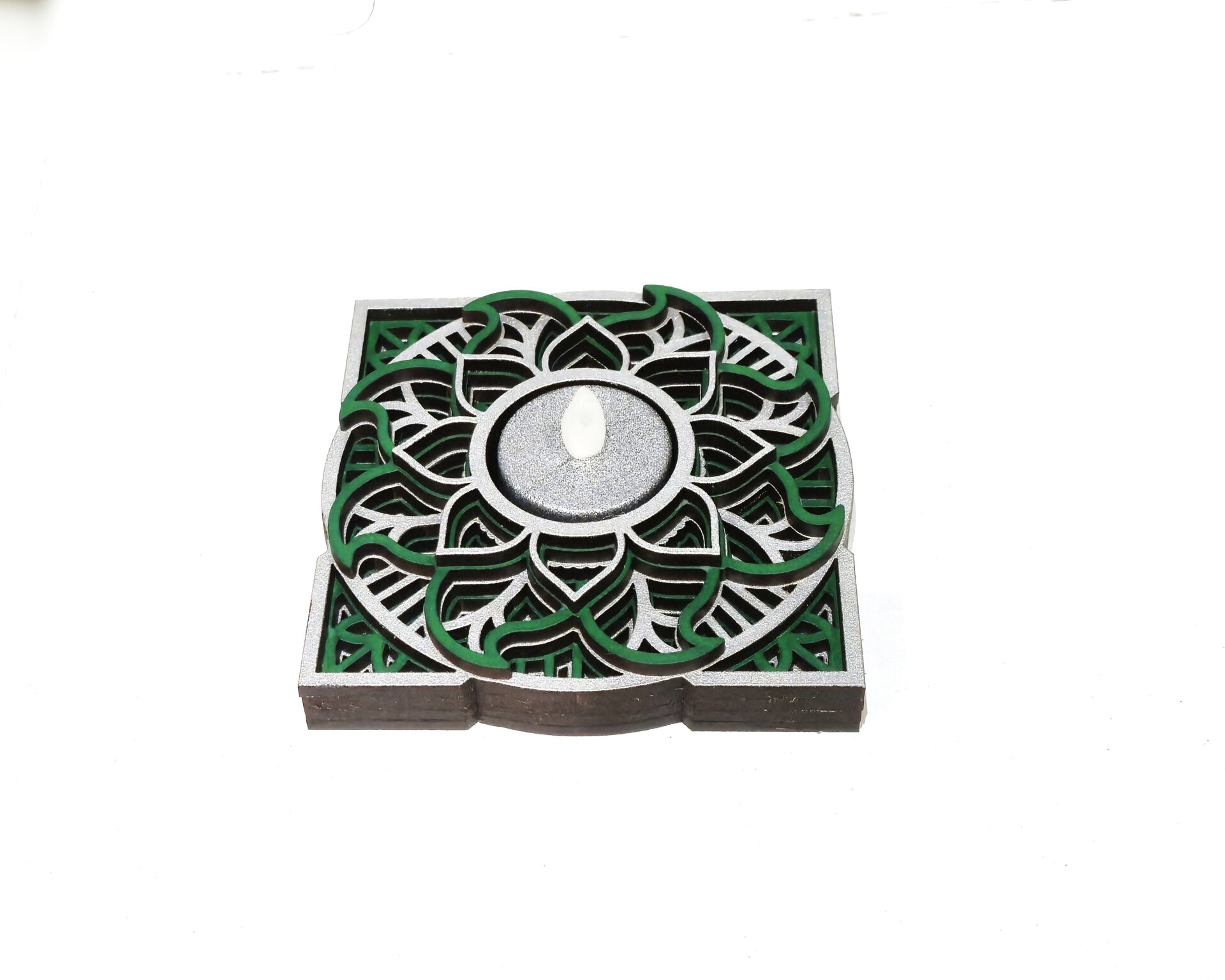 Suport decorativ pentru lumânare, realizat din lemn decupat laser în 6 straturi, cu model mandala geometric și floral. Cu dimensiuni compacte de 11 × 11 × 1,5 cm, este ideal pentru decoruri de masă, ritualuri simbolice sau cadouri artizanale.