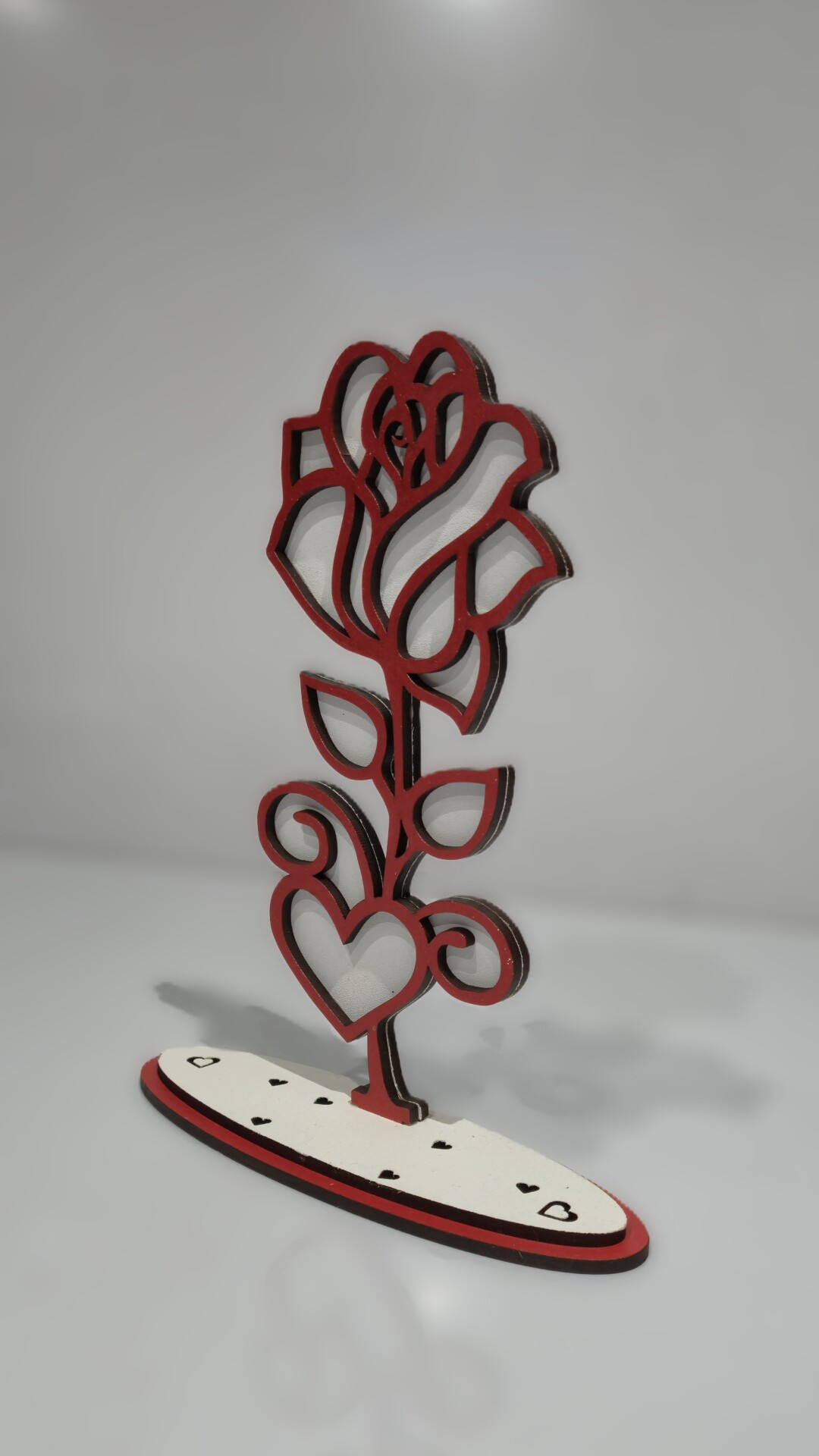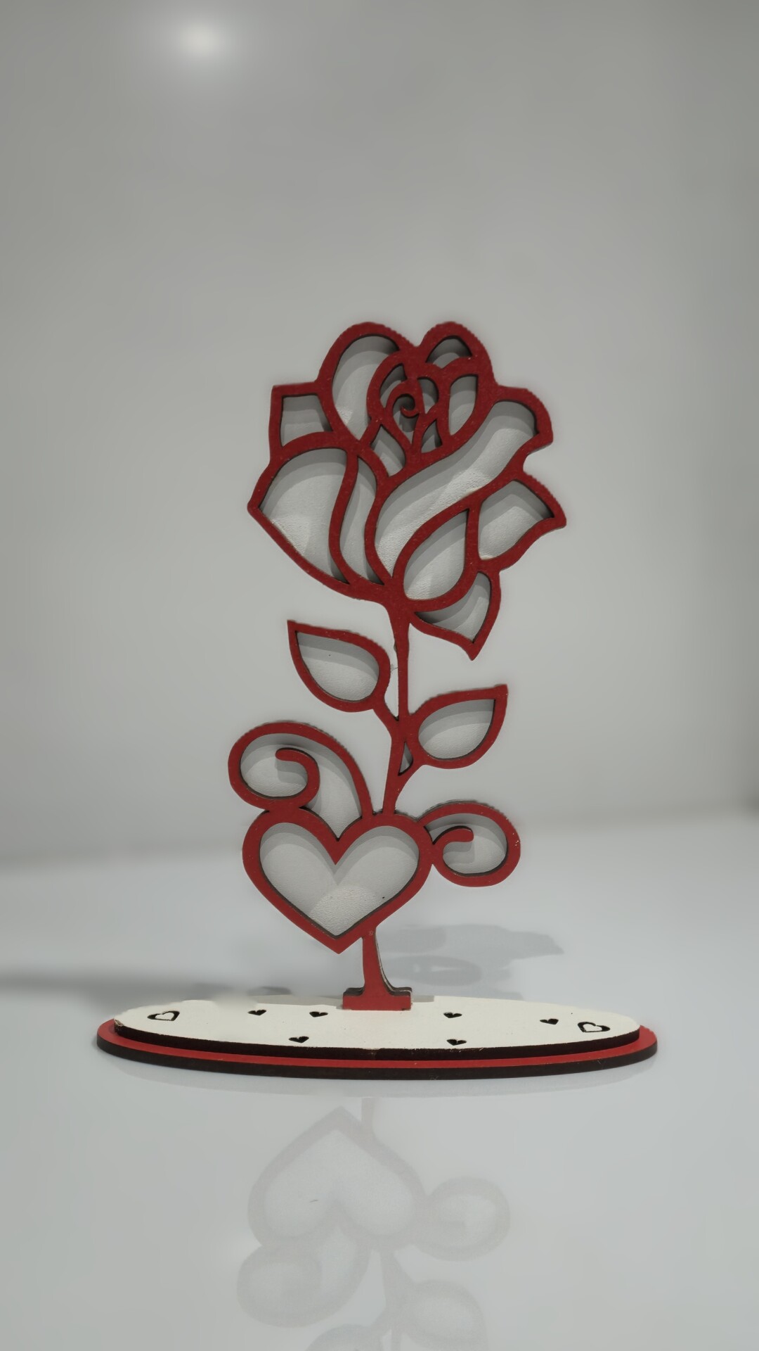 Trandafir decorativ cu inimoară, realizată din două planuri (unul alb – fond permanent și unul la alegerea dvs.), la care se poate adăuga un mesaj (selectat din listă) ce va fi aplicat în interiorul inimioarei și un mesaj (selectat din listă) ce va fi gravat pe suport.