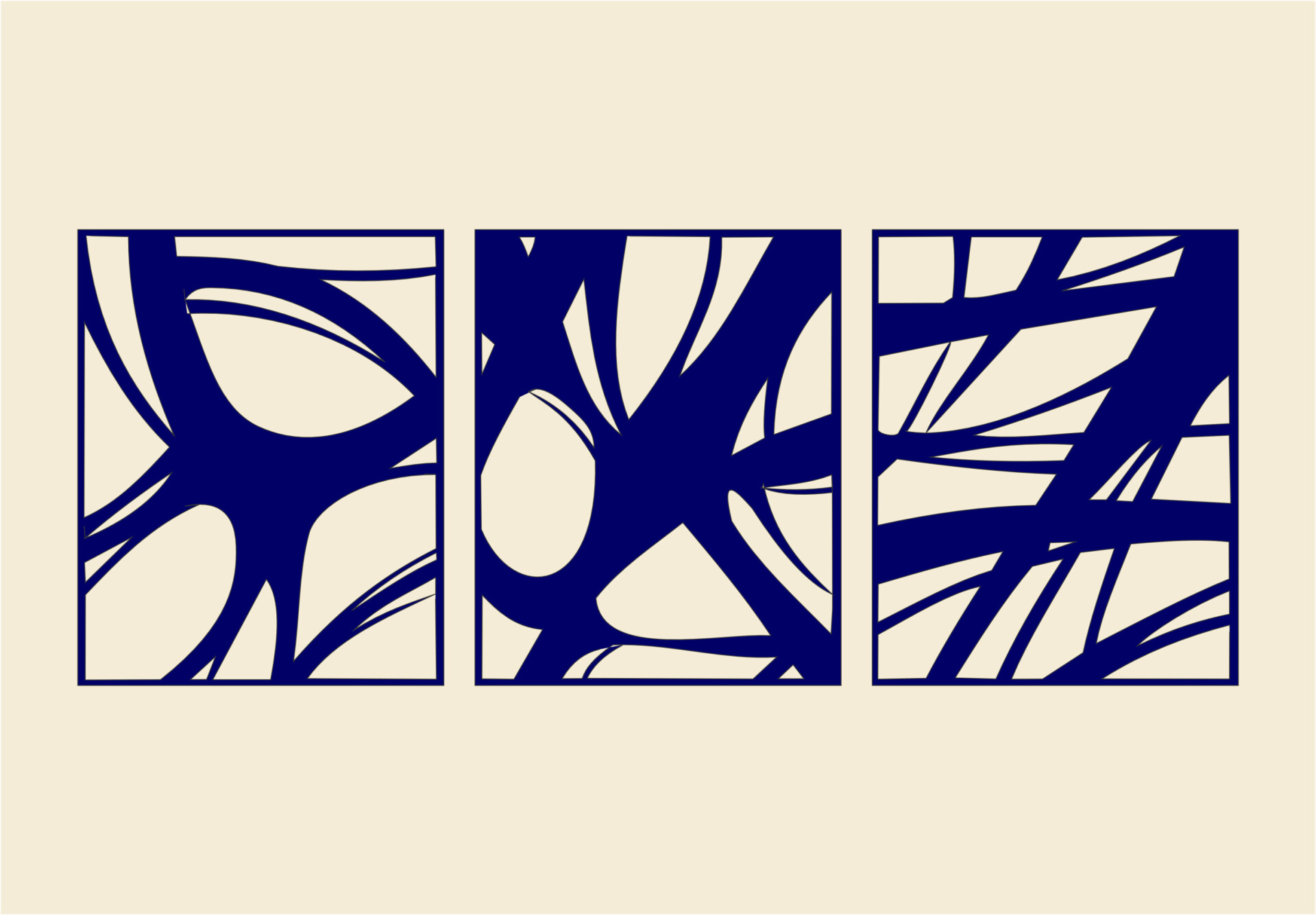 Un ansamblu artistic format din trei panouri decorative din lemn, ce redau un joc fluid de forme curbe și interconectate. Designul abstract, cu accente albastre pe fundal crem, creează un efect vizual dinamic și coerent, ideal pentru spații moderne, vitrine tematice sau decoruri creative.